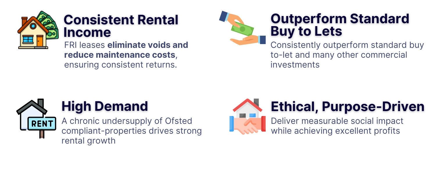 Children's Homes have historically outperformed standard buy-to-lets and many commercial investments. Our FRI lease structure (typically 5-10 years) also eliminates voids and reduces maintenance costs.