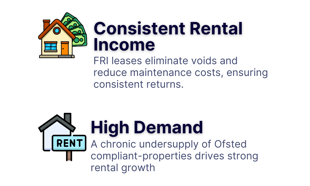 Severe National Shortage- A chronic under supply of Ofsted compliant properties drives strong rental growth. Plus, government backed funding means that local authorities pay premium rates for long term placements.